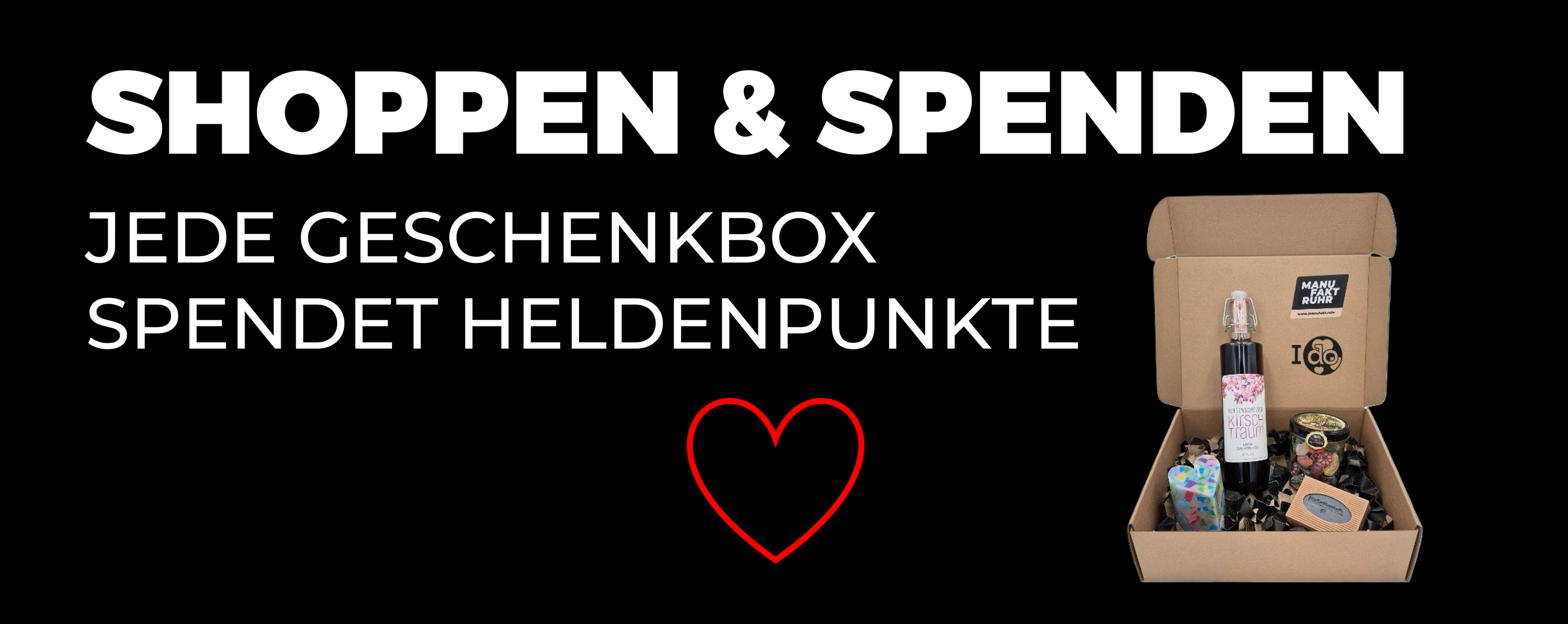 Beim Kauf von Geschenkboxen ist Schenken doppelt so schön: Du verschenkst nicht nur qualitativ hochwertige Produkte aus der Region, sondern tust auch noch etwas Gutes. Für jede gekaufte Box spenden wir Heldenpunkte. Jeder Heldenpunkt entspricht einem Euro.